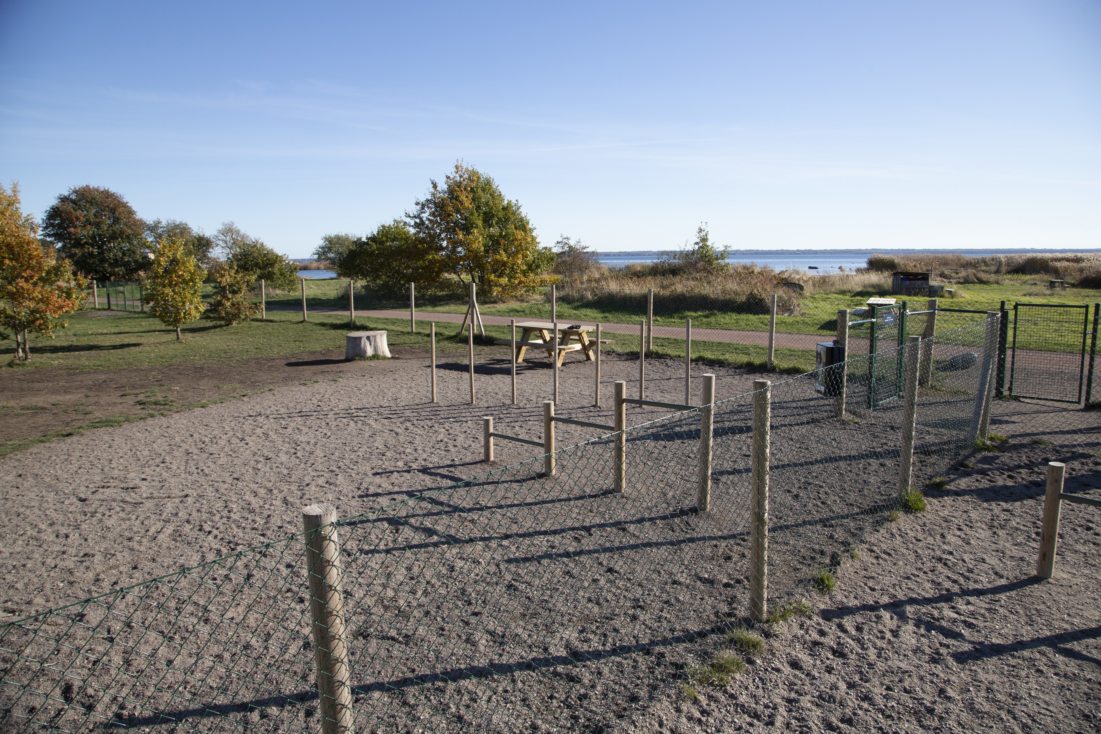 Hundrastgården ligger i Kalmarsundsparken ut med grusvägen som går mellan badplatserna.